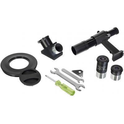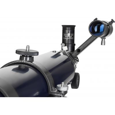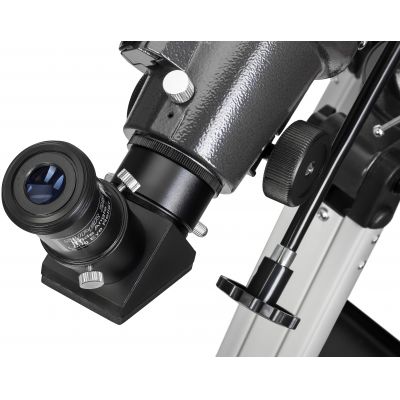 | Линзы объектива имеют полное многослойное просветление, поэтому телескоп передает яркое и контрастное изображение. В стандартную комплектацию включены окуляры 10 и 25 мм, благодаря чему можно выбрать подходящее увеличение для наблюдений: | 90х (с окуляром 10 мм) или 36х (с окуляром 25 мм). Также в наборе идет диагональное зеркало, необходимое для комфортного наблюдения наземных объектов и астрономических целей в зените. |