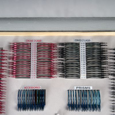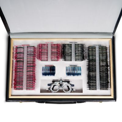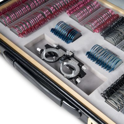 | Вспомогательные линзы: | плоскопараллельные пластины для диагностики ложной слепоты, точечная и щелевая диафрагмы для обнаружения и коррекции астигматизма, окклюдер для покрытия необследуемого глаза, матированная линза для проверки зрения у младенцев или для замены окклюдера, если проверка проводится вне помещения, цилиндр Мэддокса для измерения силы глазной мышцы и обследования скрытого и явного страбизма, скрещённые цилиндры для уточнения степени астигматизма, а также линза с перекрестием для нахождения центра зрачка и определения межзрачкового расстояния. |