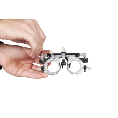 | Универсальная оправа: | Универсальная пробная оправа регулируется с помощью шарнирных винтов и подходит для проверки зрения у пользователей с различной формой и размером головы. Два зажима оправы удерживают до 4 линз каждый, позволяя точно выбрать подходящую диоптрию. Регулировка оправы даёт возможность изменять ось цилиндрических и призматических линз и межзрачковое расстояние, а также найти удобное положение подушки для носа. |