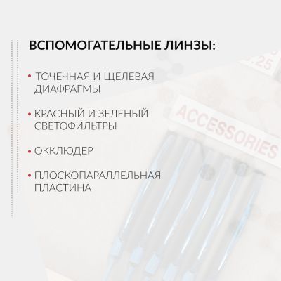 | Вспомогательные линзы: | Окклюдер; Точечная диафрагма; Щелевая диафрагма; Красный светофильтр; Зеленый светофильтр; Плоскопараллельная пластина |