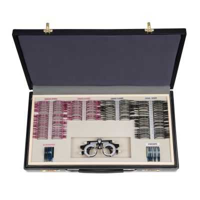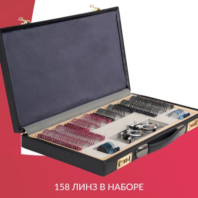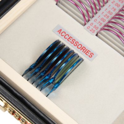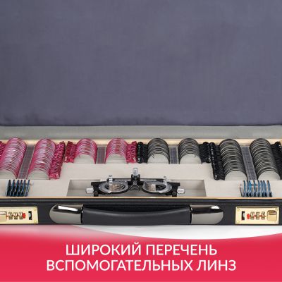 | Вспомогательные линзы: | Для более детальной диагностики зрения в наборе есть вспомогательные линзы: цветные светофильтры (красный и зелёный) для обследования цветового восприятия, плоскопараллельная пластина для диагностики ложной слепоты, точечная и щелевая диафрагмы для диагностики и коррекции астигматизма, а также окклюдер для покрытия необследуемого глаза. |